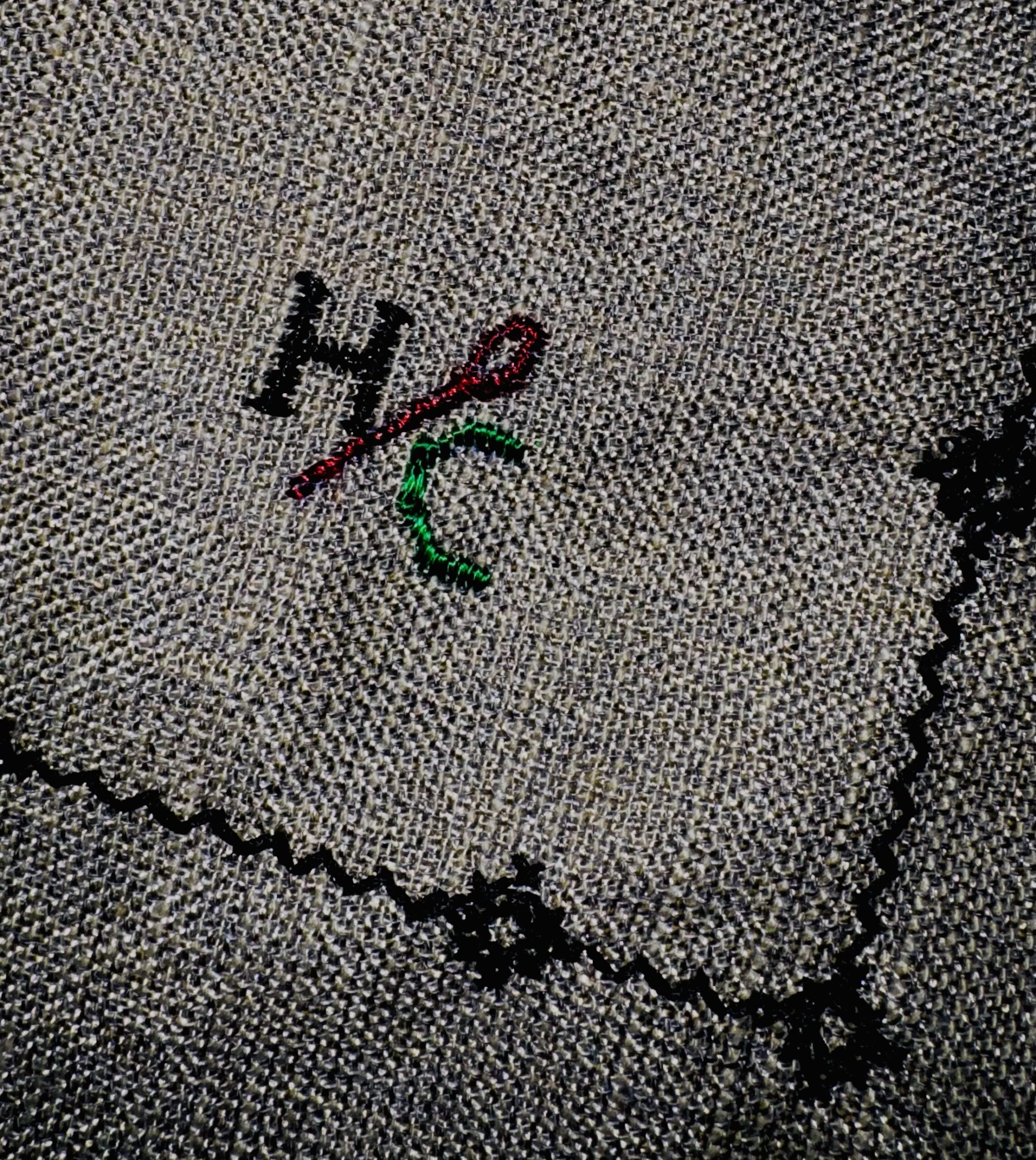 It showcasing traditional needlework and delicate detailing. The design features an elegant rectangular border stitched in black, accented with small geometric motifs. At the top and bottom, floral patterns in soft purple and green add a touch of color and charm. Made on a textured grey fabric, the embroidery highlights the artisan’s precision and cultural craftsmanship. Subtle initials stitched in one corner complete the piece, giving it a personal, handmade touch.